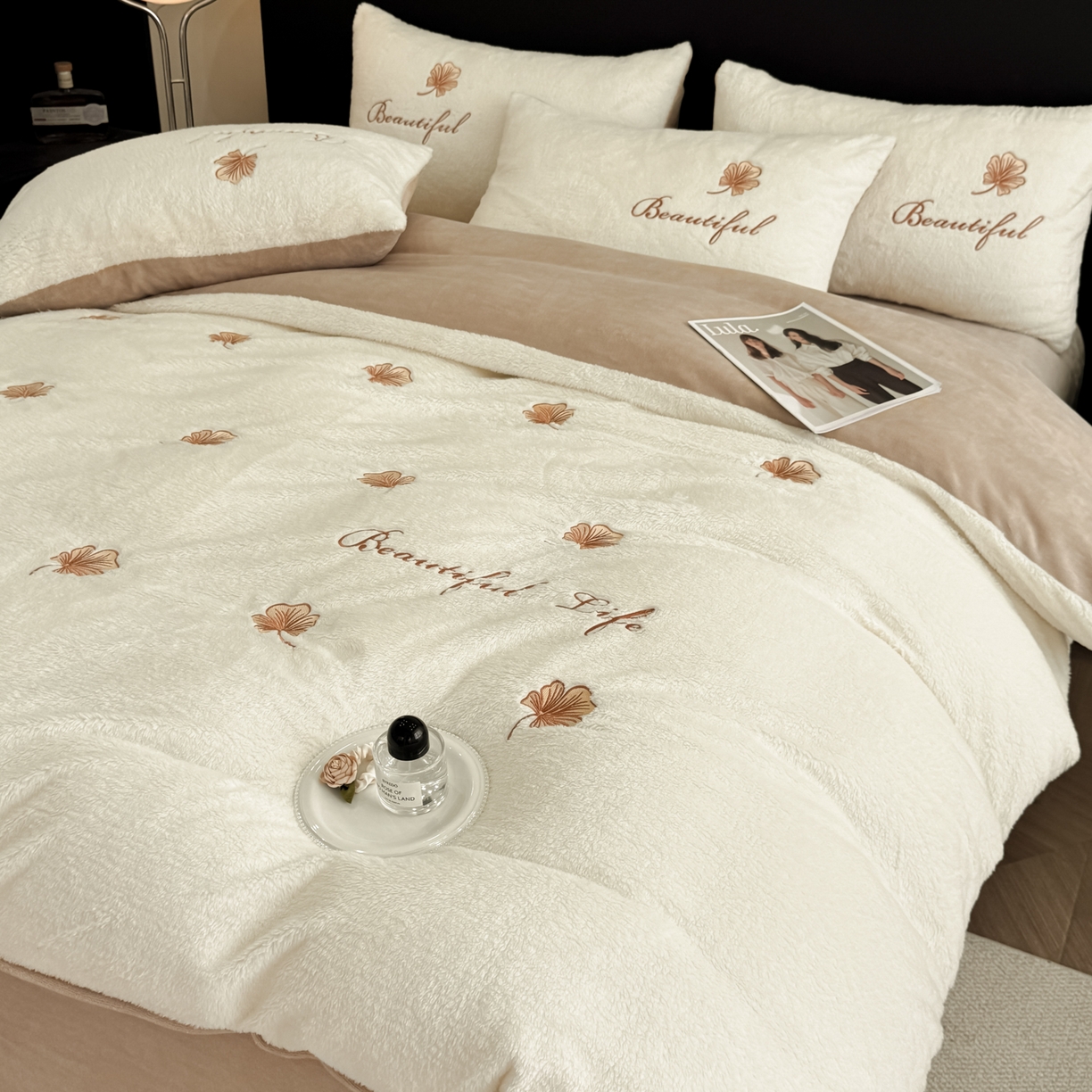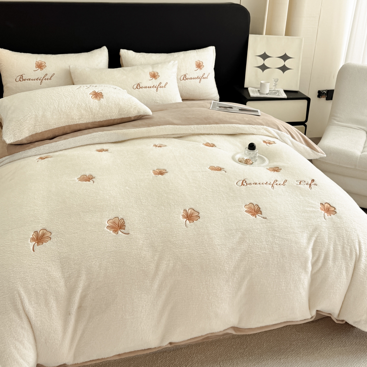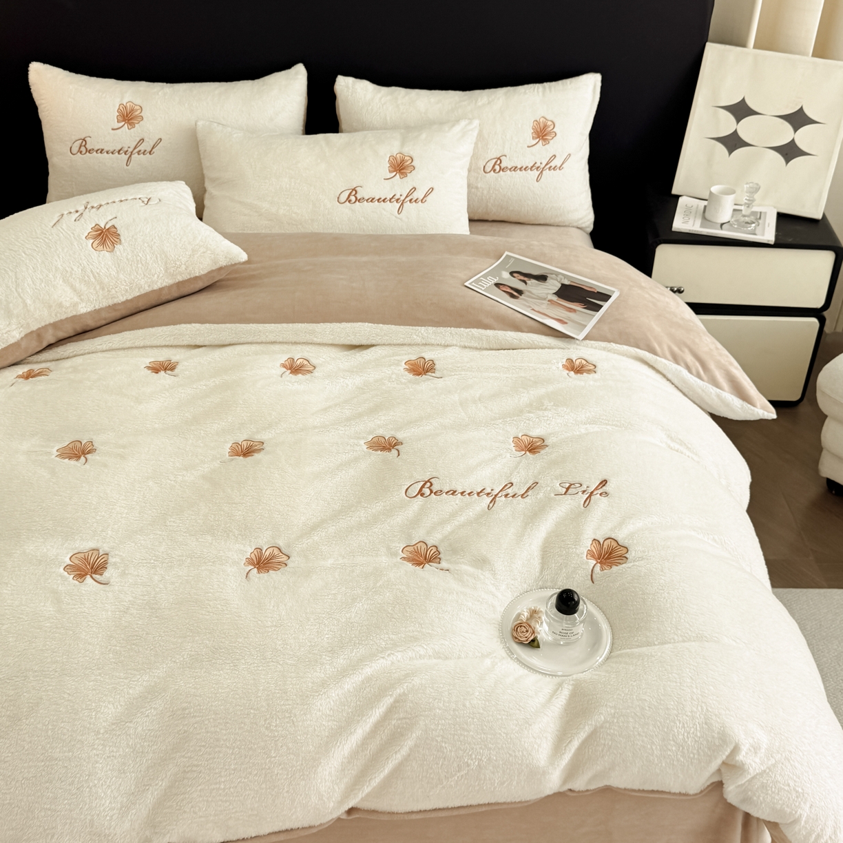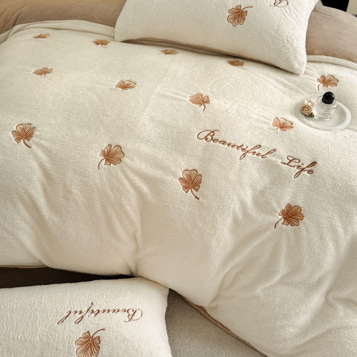 宇航家纺 2025新款A类北极绒牛奶绒大版绣花四件套 绒银杏叶白拼卡其