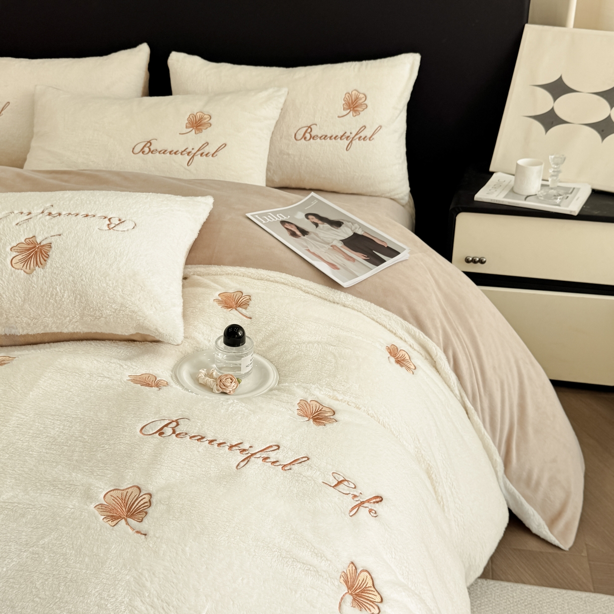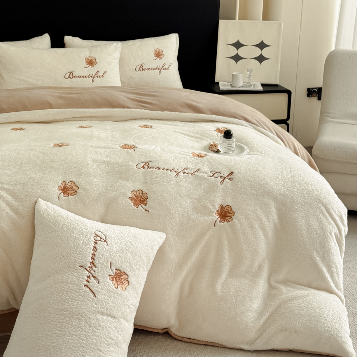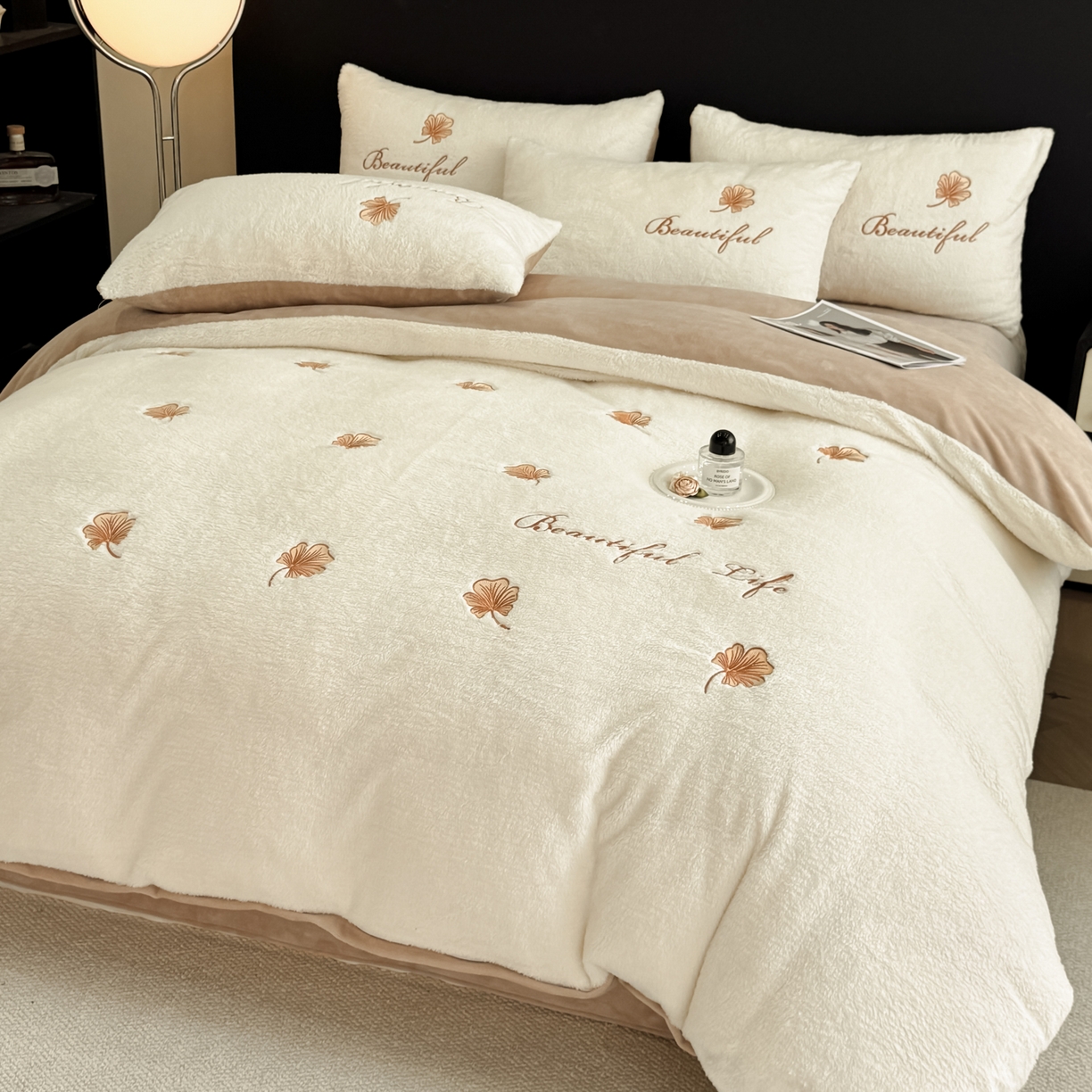 宇航家纺 2025新款A类北极绒牛奶绒大版绣花四件套 绒银杏叶白拼卡其