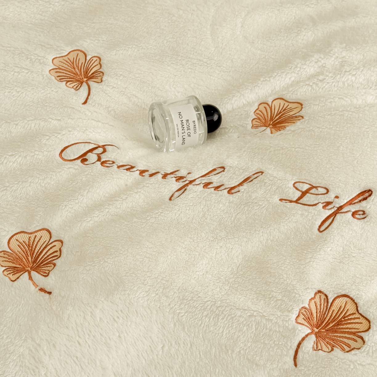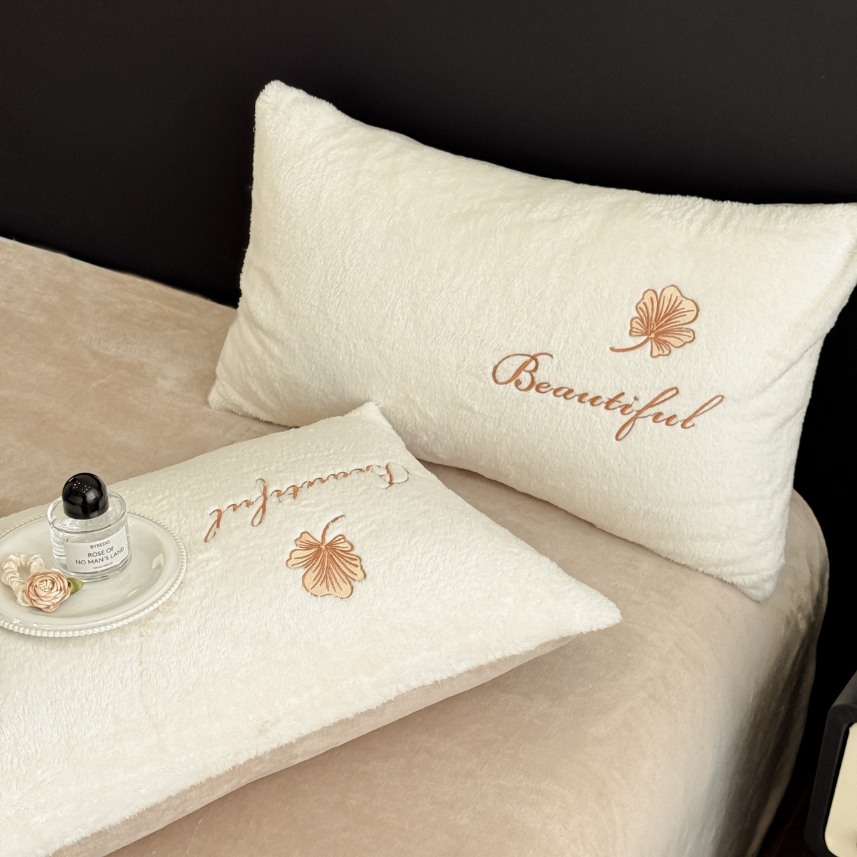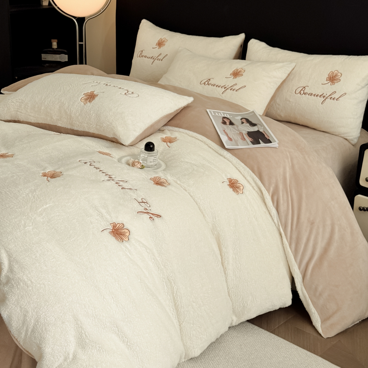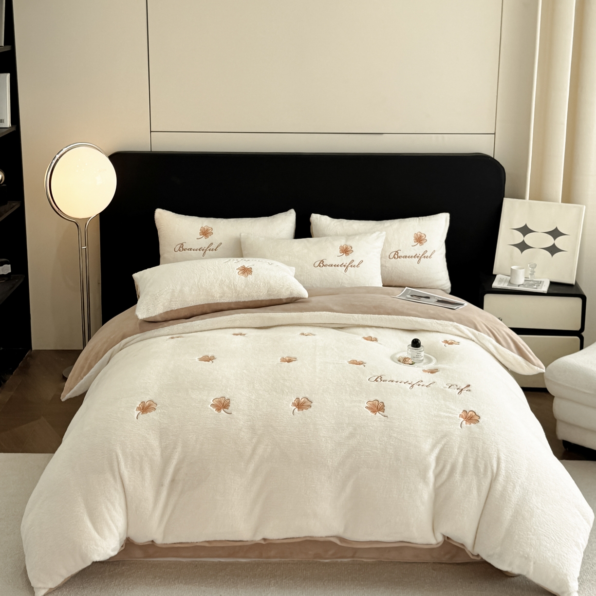 宇航家纺 2025新款A类北极绒牛奶绒大版绣花四件套 绒银杏叶白拼卡其