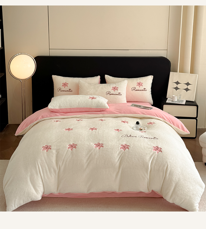2025新款A类轻奢风宽边牛奶绒绣花四件套-蝴蝶结爱心
