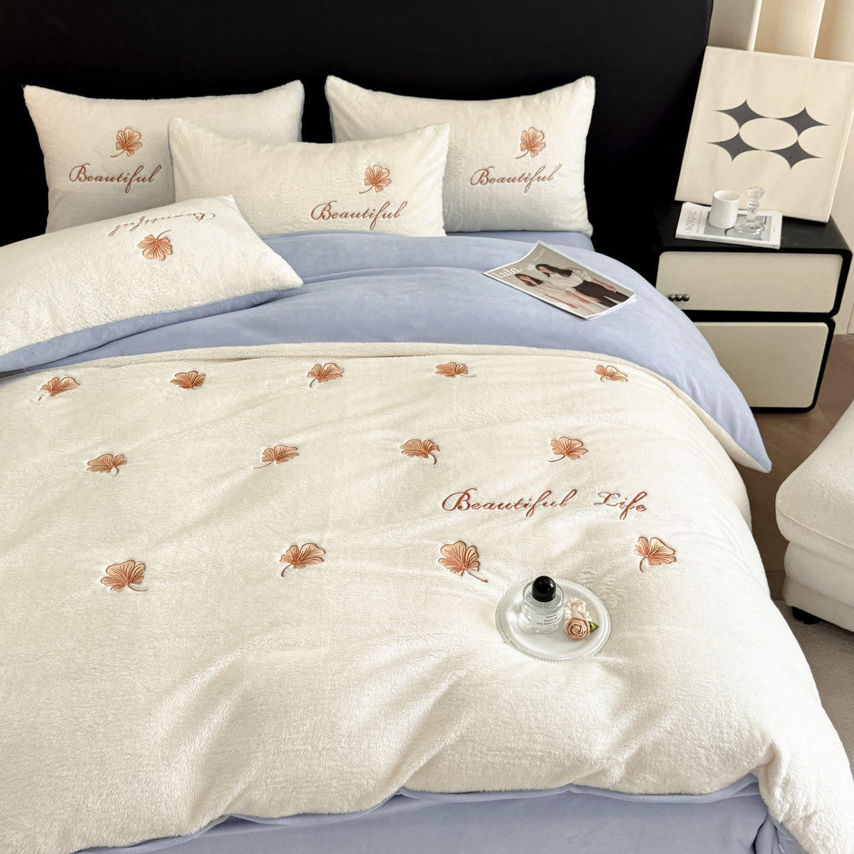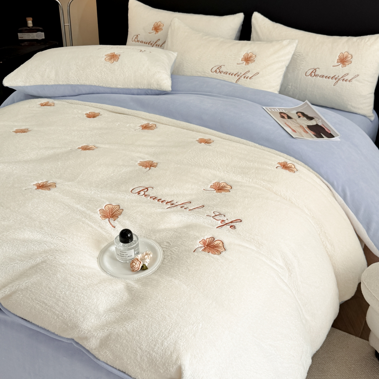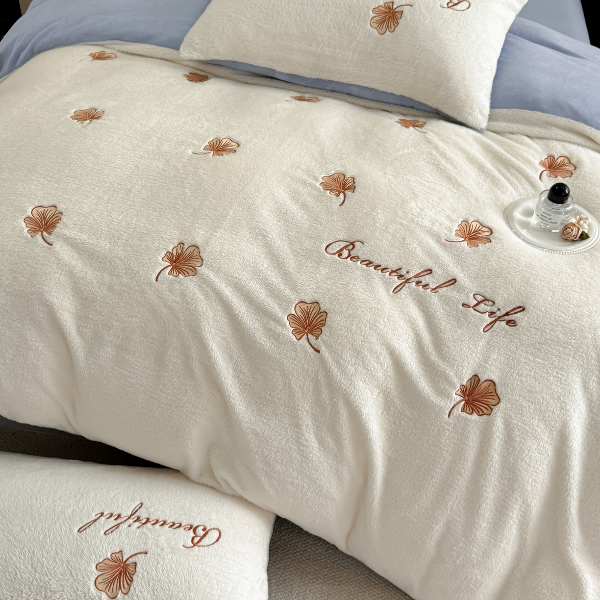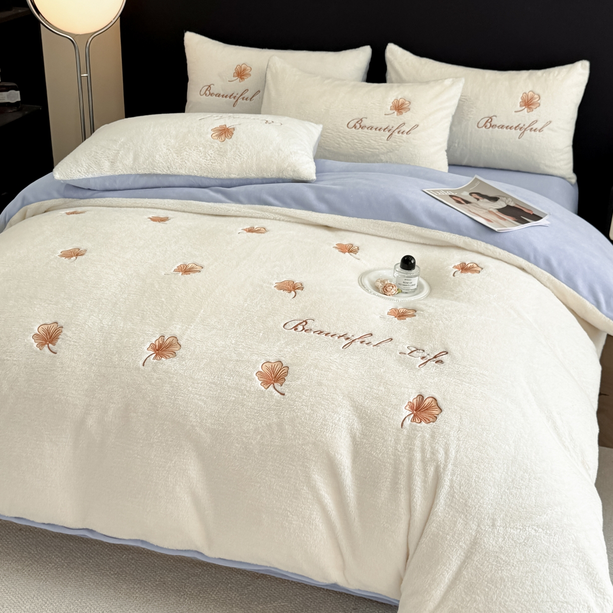 宇航家纺 2025新款A类北极绒牛奶绒大版绣花四件套 绒银杏叶白拼蓝灰