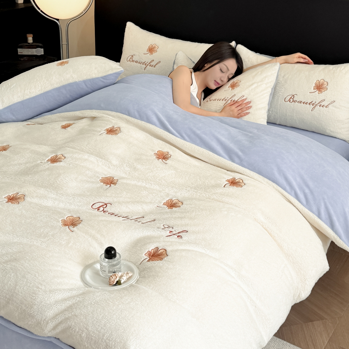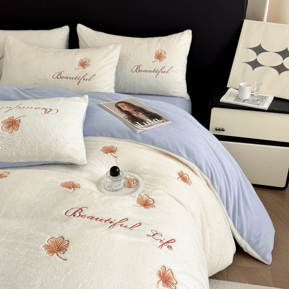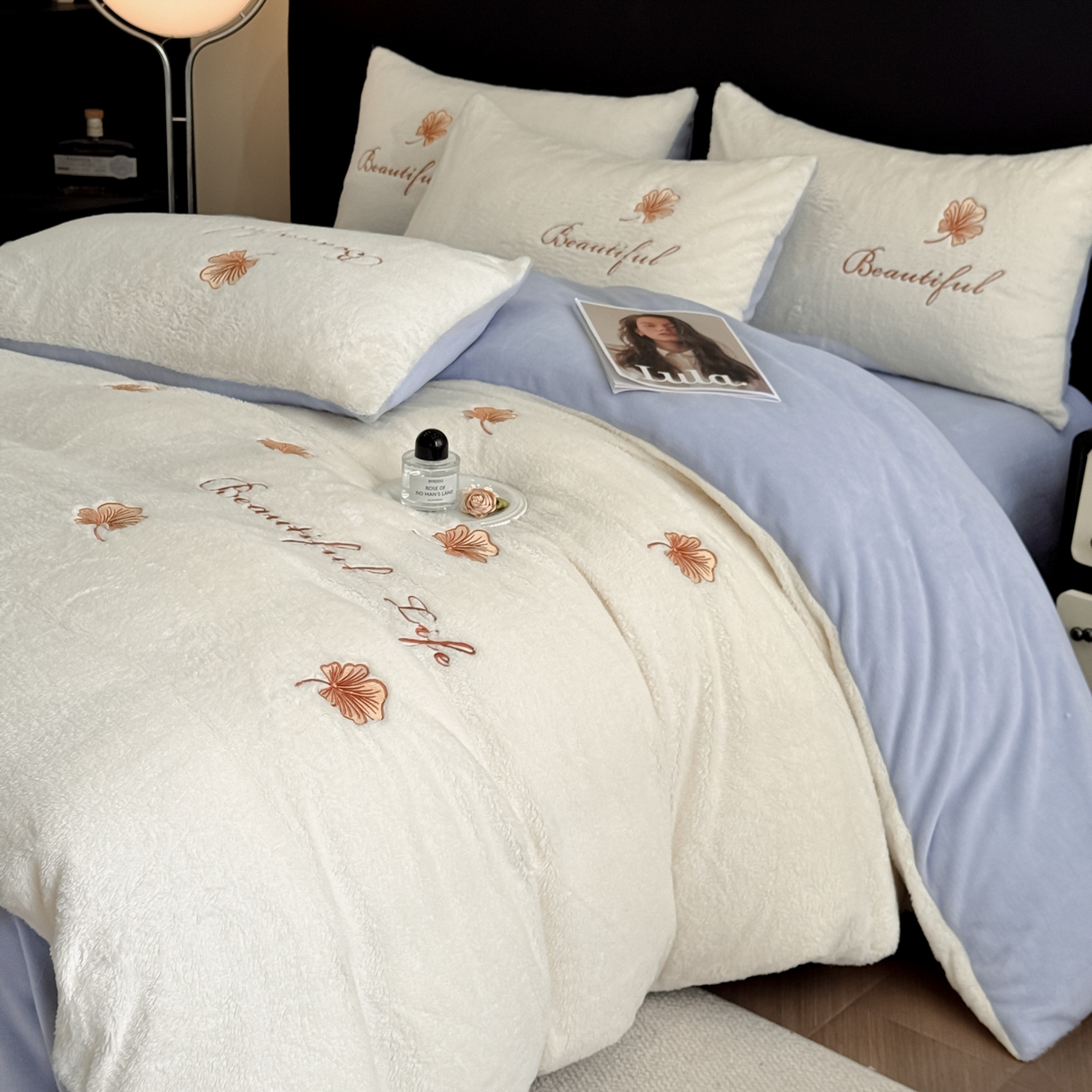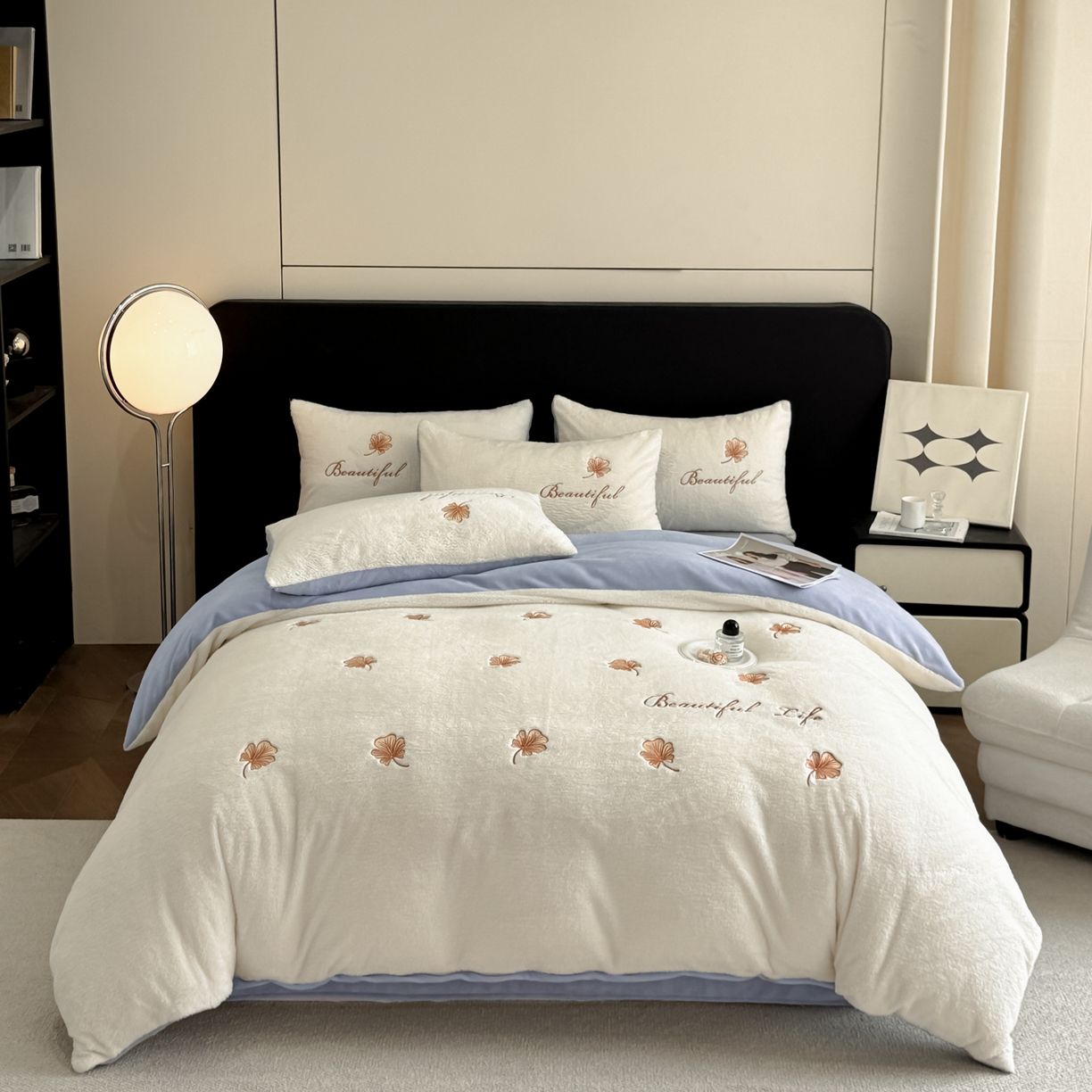 宇航家纺 2025新款A类北极绒牛奶绒大版绣花四件套 绒银杏叶白拼蓝灰