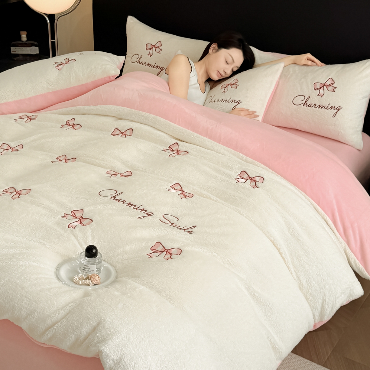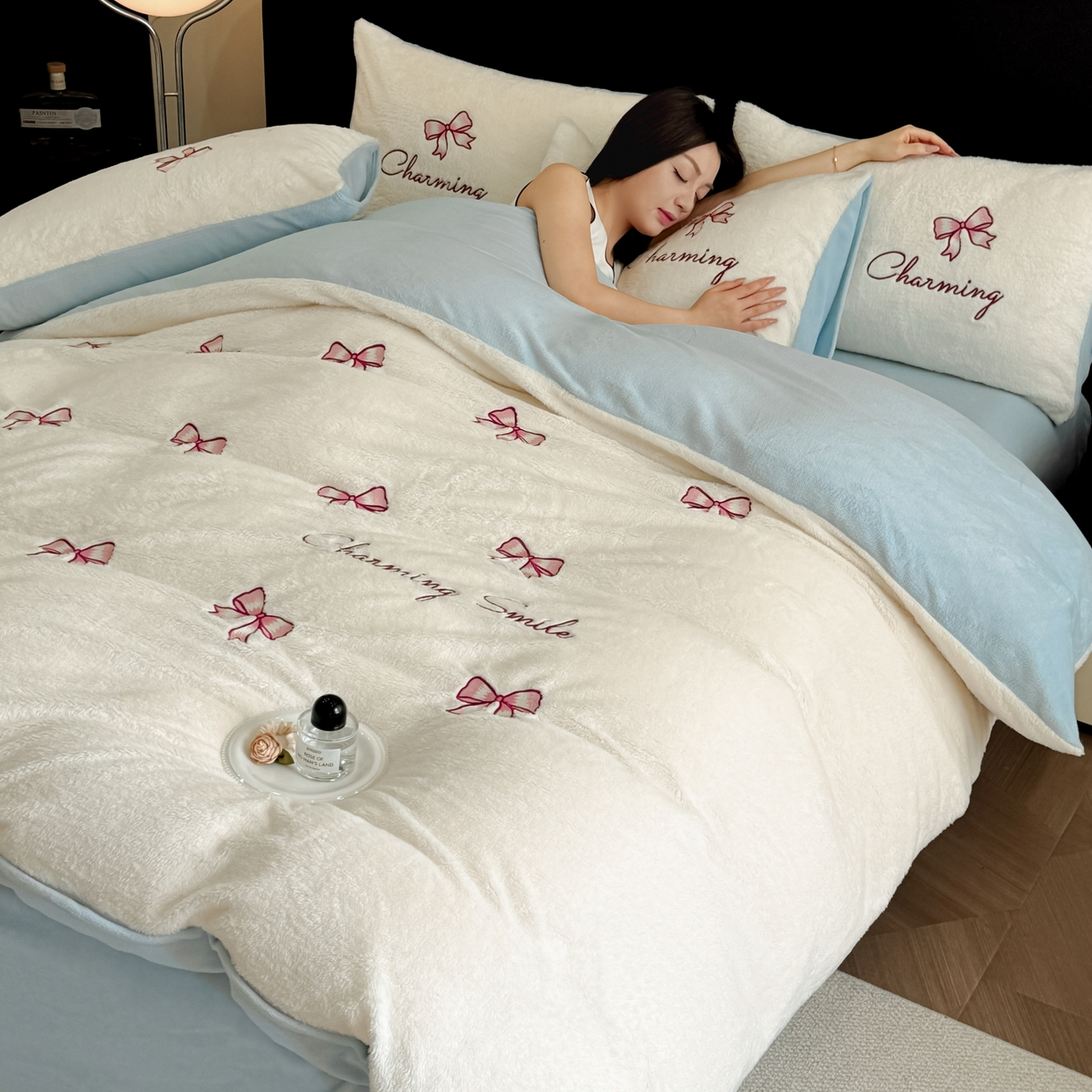 2025新款A类轻奢风宽边牛奶绒绣花四件套-蝴蝶结爱心