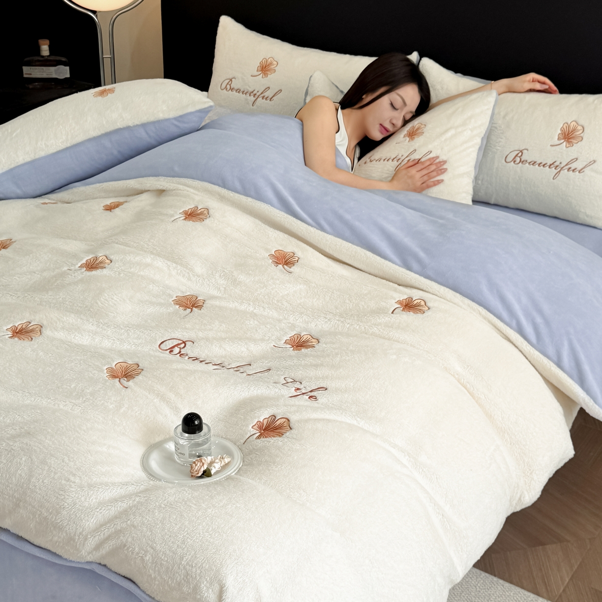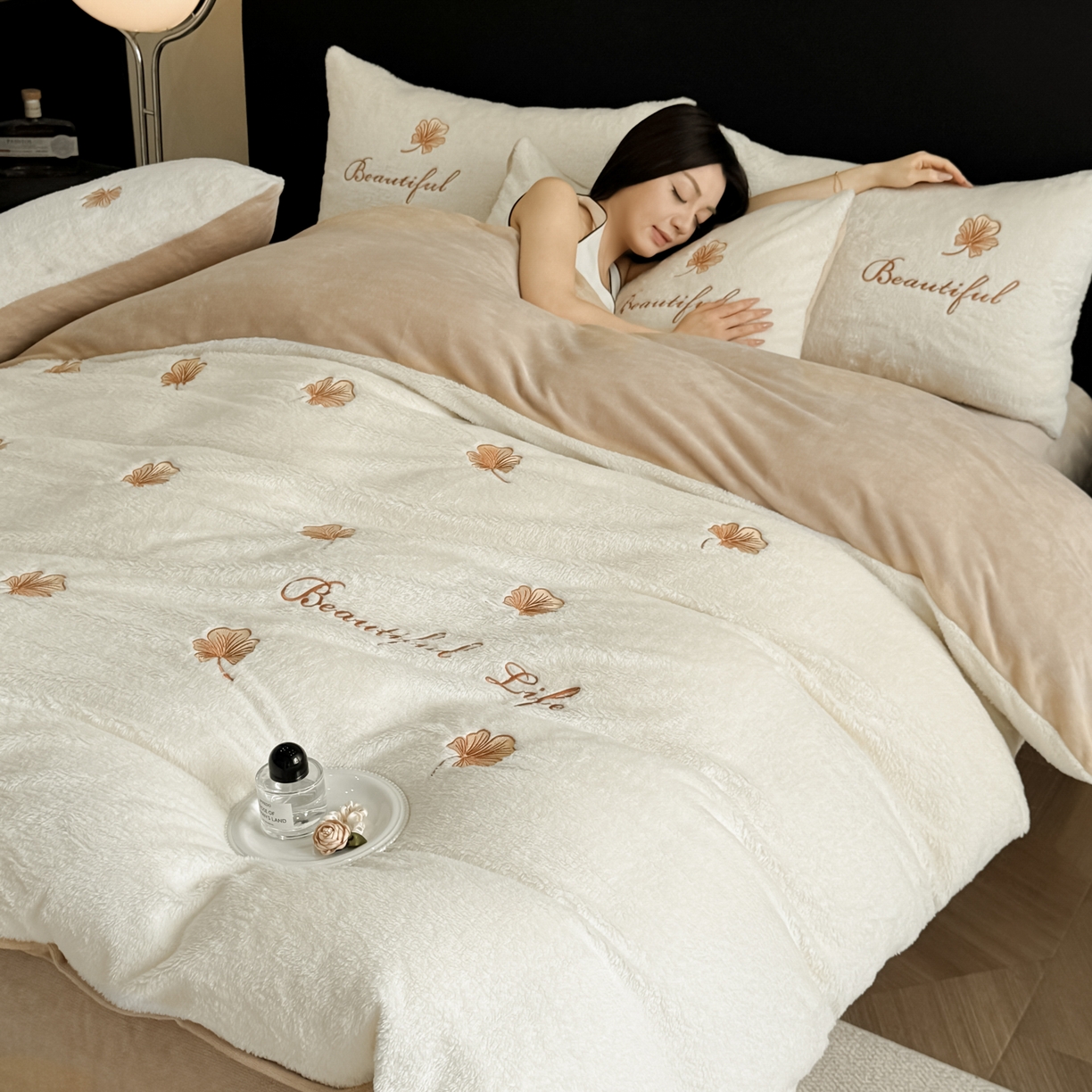 宇航家纺 2025新款A类北极绒牛奶绒大版绣花四件套 绒银杏叶白拼卡其