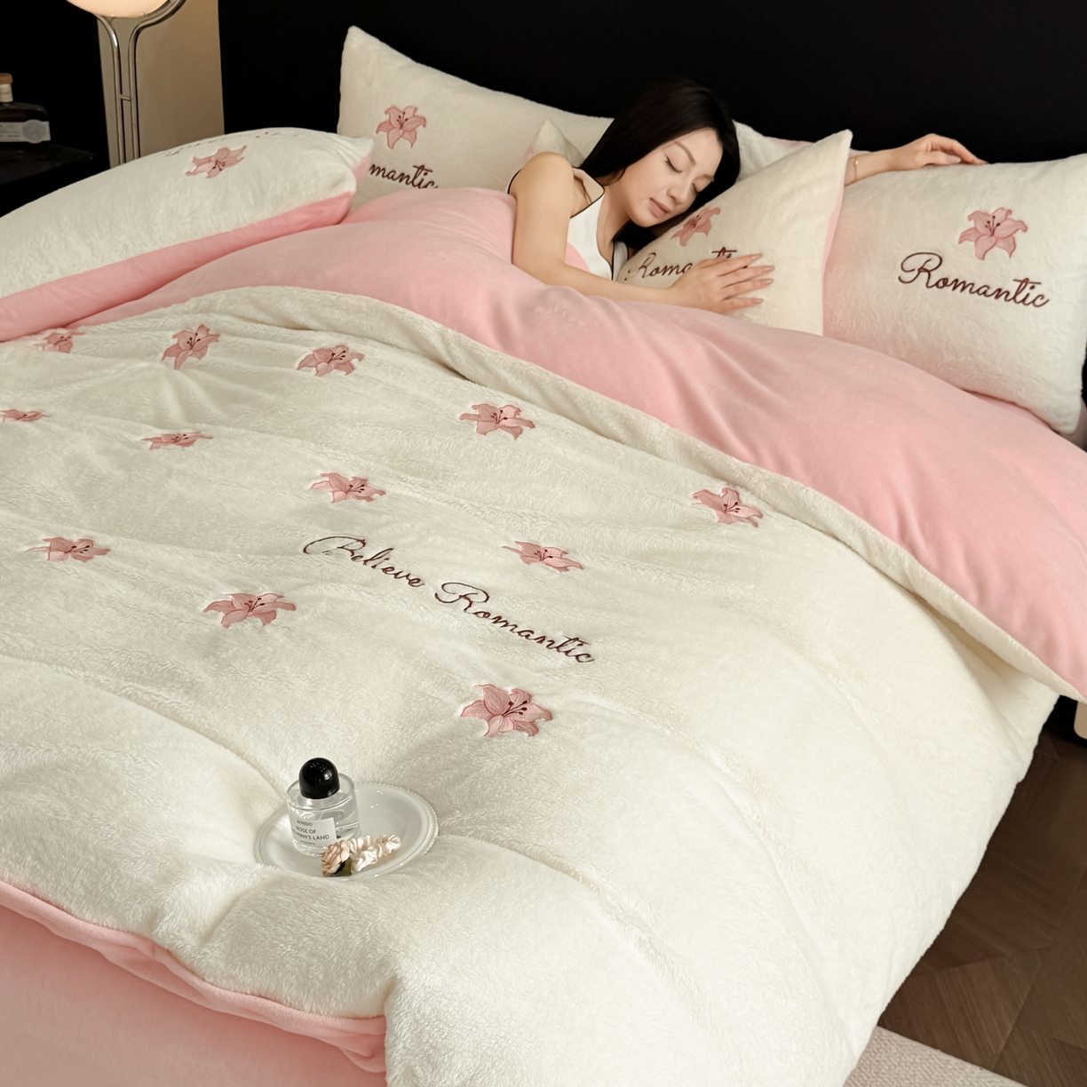 宇航家纺 2025新款A类北极绒牛奶绒大版绣花四件套 绒百合花白拼粉玉
