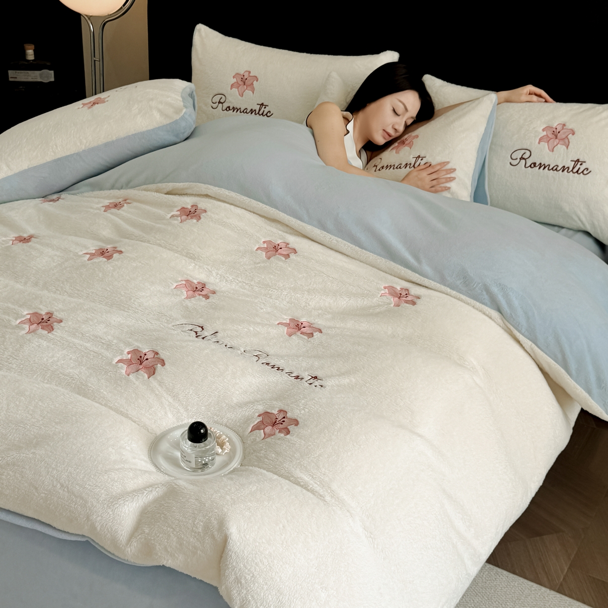 宇航家纺 2025新款A类北极绒牛奶绒大版绣花四件套 绒百合花白拼天蓝
